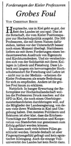 Und weiter: „Hierfür kommt nach Ansicht der Professoren nur der Standort Kiel in Frage, da Spitzenforschung nur dort möglich ist, wo eine Vielzahl von Fächern und Fakultäten vorhanden sei. Die notwendige Vernetzung der medizinischen Grundlagenforschung mit der Biologie, Chemie, Physik und Psychologie sei an keinem anderen Standort im Lande gegeben“ (Flensburger Tageblatt 7. März 2003, S. 5).
