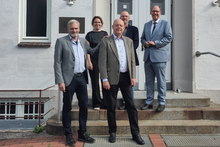 Das Team hinter der neuen Lübecker Ausgründung PAROGENA GmbH, die neuartige Wirkstoffe gegen Parodontose entwickelt, gemeinsam mit Vertreter*innen des Präsidiums der Universität: v.l.n.r. Thomas Nawrocki, Prof. Dr. Moreen Heine, Prof. Dr. Georg Sczakiel, Holger Fischer, Prof. Dr. Helge Braun (Foto: Dr. Anja Stähle)