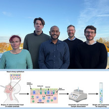 Priv.-doz. Anke Fähnrich, Prof. Hauke Busch, Dr. Karosham Reddy, Prof. Markus Weckmann und Yamil Maluje (oben v.l.n.r.; Foto: W. Nurieva, Universität zu Lübeck) - Darunter eine Abbildung aus der genannten Veröffentlichung: Nasale Proben wurden mit einer Kürette entnommen, wobei das Epithel und die lokale Immunpopulation erfasst wurden. Die Proben wurden verarbeitet und dissoziiert, um eine Einzelzell-Suspension für die nachgeschaltete Einzelzell-RNA-Sequenzierungsanalyse zu erstellen (https://www.nature.com/articles/s41467-025-64778-0/figures/1)