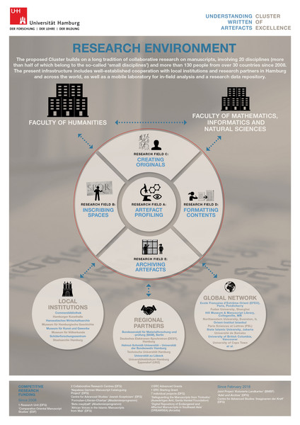 Das Forschungscluster „Understanding Written Artefacts“ untersucht das Schreiben als eine der wichtigsten kulturellen Techniken, die die Gesellschaften der Welt geprägt haben. Für den größten Teil der Menschheitsgeschichte war das Schreiben Teil verschiedener und komplexer Manuskriptkulturen. Schriftliche Artefakte wurden bis heute ununterbrochen produziert, obwohl die Erfindung des Druckens mit beweglichen Typen einige marginalisierte und gleichzeitig neue, nicht zuletzt auch digitale Medien hervorbrachte.