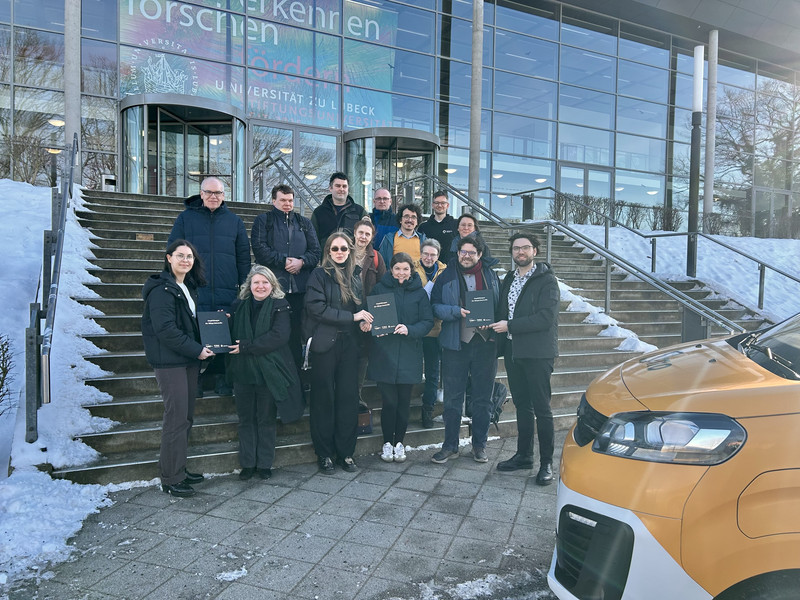 Dr. Tim Schrills (vorne rechts) von der Universität zu Lübeck hat mit weiteren Forschenden, Vertreter*innen der Stadtwerke Lübeck und der Bürger*innenräte Empfehlungen an Senatorin Joanna Hagen (2. v. l.), Julia Samtleben (vorne Mitte) und Michael Stödter (2. v. r.) übergeben. (Foto: Elena Vogt / Uni Lübeck)