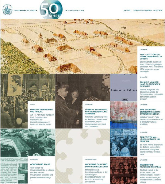 Auf der Internetseite www.uni-luebeck.de/50jahre werden das Veranstaltungsprogramm und alle Informationen zum Jubiläumsjahr aktuell zusammengestellt. Sie informiert über das aktuelle Geschehen an der Universität und lässt die Entwicklung von der Medizinischen Akademie (1964-1973) über die Medizinische Hochschule (1973-1985) und Medizinische Universität (1985-2002) bis zur heutigen Universität lebendig werden. Die Vorgeschichte der Universität mit der Heilanstalt Strecknitz und ihrem schrecklichen Ende unter den Nationalsozialisten rückt dabei ebenso in den Blick wie die künftige Entwicklung mit der angestrebten Umwandlung zur Stiftungsuniversität.