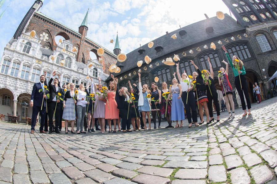 Bereits vor der Feier in der Universitätskirche hatte Bürgermeister Jan Lindenau die Promovierten wie auch in den vergangenen Jahren zu einem persönlichen Empfang im Rathaus der Hansestadt eingeladen. Zur Verabschiedungsfeier gingen sie über den Markt nach St. Petri.