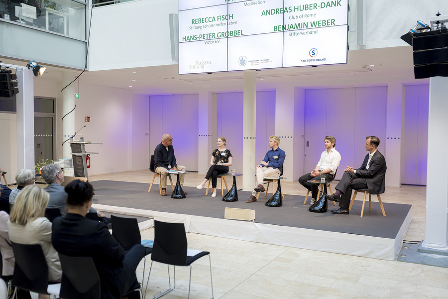 Im Rahmen einer Podiumsdiskussion war auch er zu Gast bei dem von Andreas Bormann moderierten Gespräch, in dem es um einen Austausch der Generationen ging. Weitere Gäste waren Rebecca Fisch von der Stiftung Schüler helfen Leben, Hans-Peter Grobbel von Victor e.V. und Benjamin Weber vom Stifterverband. Stiften und Engagement treffen gerade den Zeitgeist, war sich Rebecca Fisch sicher: "Wir bekommen gerade unfassbar viel Unterstützung. Menschen engagieren sich wieder. Das hängt aber auch von den Formaten ab: Unser sozialer Tag z.B., an dem Schüler arbeiten und ihr Gehalt spenden, ist oft ein Anstoß zum Weitermachen. Mich frustriert, dass ich älteren Generationen überhaupt erst erklären muss, warum Themen wichtig sind."