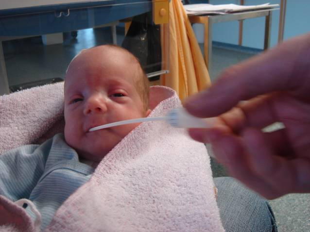 Abb. 1: Entnahme eines Mundschleimhautabstriches zur Untersuchung von genetischen Risikofaktoren für schwere Erkrankungen bei sehr kleinen Frühgeborenen