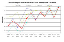 An der Physikumsprüfung haben in diesem Jahr in Lübeck 163 Studentinnen und Studenten teilgenommen, 81,0 Prozent davon in der Regelstudienzeit (Bundesdurchschnitt: 77,2 Prozent). Seit Herbst 2009 liegt die Misserfolgsquote für den schriftlichen Teil des ersten Abschnitts in Lübeck deutlich unterhalb des Bundesdurchschnitts (Abb. 1). In allen sechs Prüfungsfächern liegt die Hansestadt oberhalb des Bundesdurchschnitts. In Physiologie und Biochemie belegt sie sogar den ersten und in Anatomie den zweiten Platz (Abb. 2).