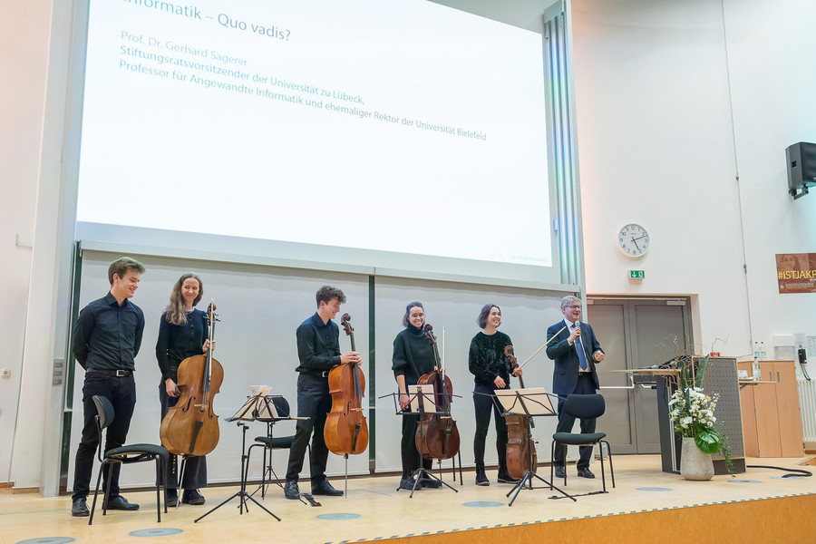Über die Entwicklung der Sektion Informatik/Technik sprach im Anschluss Prof. Dr. Stefan Fischer, Vizepräsident der Universität zu Lübeck. Eindrucksvoll belegte er mit Zahlen, welchen Wachstum die Sektion in den vergangenen Jahren für sich verzeichnen konnte. Den Festvortrag "Quo vadis Informatik" hielt dann Prof. Dr. Gerhard Sagerer, Stiftungsratsvorsitzender der Universität zu Lübeck und Professor für Angewandte Informatik.