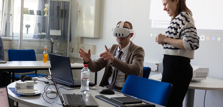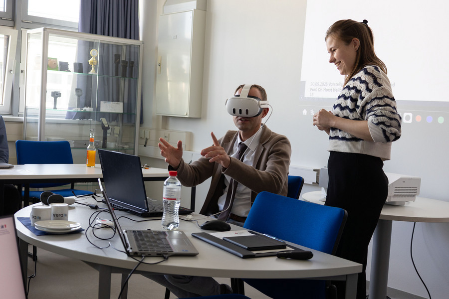 Projektmitarbeiterin Finja Wegener von der TH Lübeck zeigt Minister Dirk Schrödter einen Prototyp für eine Anwendung im Projekt. Durch die VR-Brille sieht man Sensordaten, wie zum Beispiel Temperaturdaten, die im Raum visualisiert werden (Foto: Johanna Helbing / TH Lübeck)