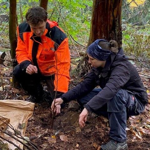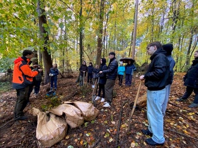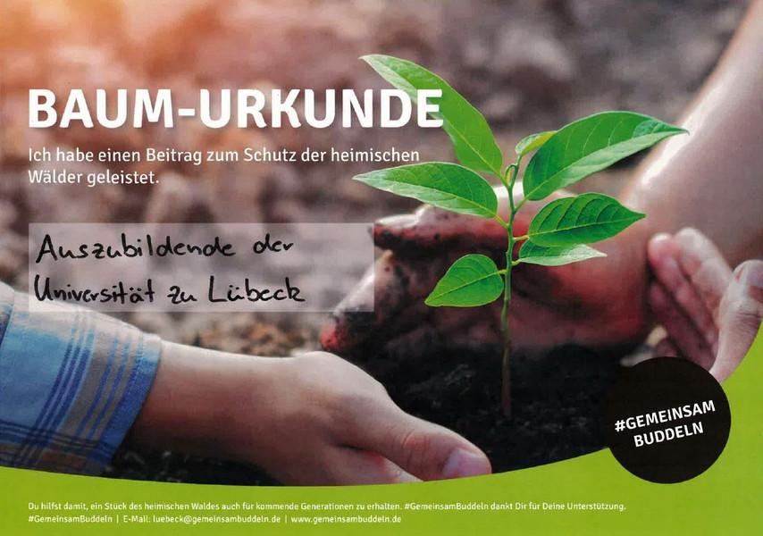 Im Rahmen ihres Nachhaltigkeitsprojektes engagieren sich die Auszubildenden der Universität auch ganz praktisch: In Waldhusen eröffneten sie am 30. Oktober die Saison und pflanzten Roterlen und Linden. Ausgerüstet mit Spaten, Handschuhen und Verpflegung trafen sie sich vormittags mit zwei Vertreter*innen des Vereins #GemeinsamBuddeln e.V. und dem Revierförster Jonas Gardlo im Wald. Danach ging es an die Pflanzstellen, wo insgesamt 150 Bäume darauf warteten, nach dem Konzept der naturnahen Waldnutzung, auch bekannt als Lübecker Waldkonzept, in die Erde zu kommen.