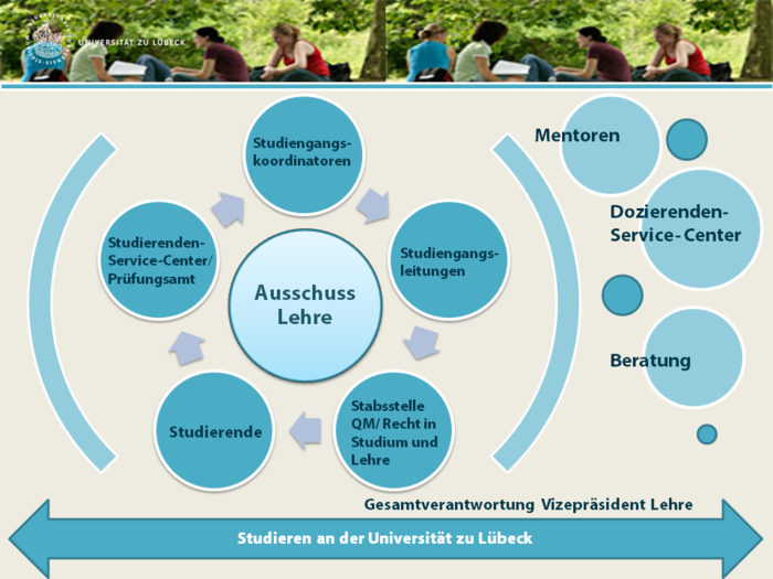 Die Qualitätssicherung in Studium und Lehre zeichnet sich durch eine starke dezentrale Verantwortung der einzelnen Studiengänge aus. Die Studiengangsleitungen sind zusammen mit den Studiengangskorrdinator_innen für die Qualitätssicherung in "ihrem" Studiengang verantwortlich. Eine Gesamtkoordination findet durch den erweiterten Senatsausschuss Lehre statt, in dem unter der Gesamtverantwortung vom Vizepräsidenten Lehre regelmäßig eine strategische Abstimmung zwischen dezentralen und zentralen Akteuren der Universität stattfindet.