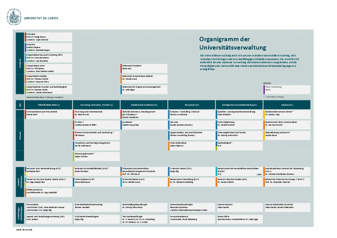 Die Universitätsverwaltung setzt sich aus der Zentralen Universitätsverwaltung sowie den Beauftragten der Universität und ihren Einrichtungen zusammen. Sie versteht sich einheitlich als eine moderne Verwaltung mit einem starken Servicegedanken, um die Kernaufgaben der Universität unter besten administrativen Rahmenbedingungen zu ermöglichen. Auf den folgenden Seiten finden Sie die Verwaltung der Universität zu Lübeck und die einzelnen Ansprechpartner*innen.
